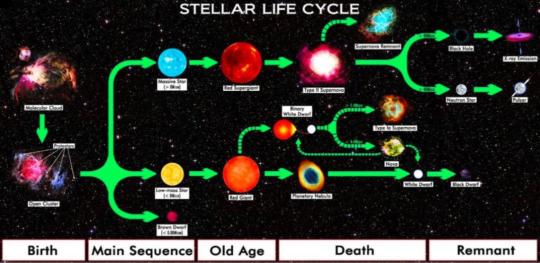 从这个图中可以看到不同质量恒星可能的生命轨迹。一般恒星在其青壮年时期是主序星,比如我们现在的太阳。不同质量的恒星从星云中诞生。中等质量的恒星包括我们的太阳寿命很长,在核聚变反应中耗尽了氢原子核以后会经历红巨星,再到白矮星甚至黑矮星的过程。而大质量的主序星随着核聚变原料的消耗,会比较短命地离开主序星队伍,经过红超巨星阶段和超新星爆发,最终坍缩成黑洞或者密度极大的中子星、脉冲星。脉冲星是高速旋转的中子星,伴随它的自转,我们能周期性地接收到它的电磁波脉冲。