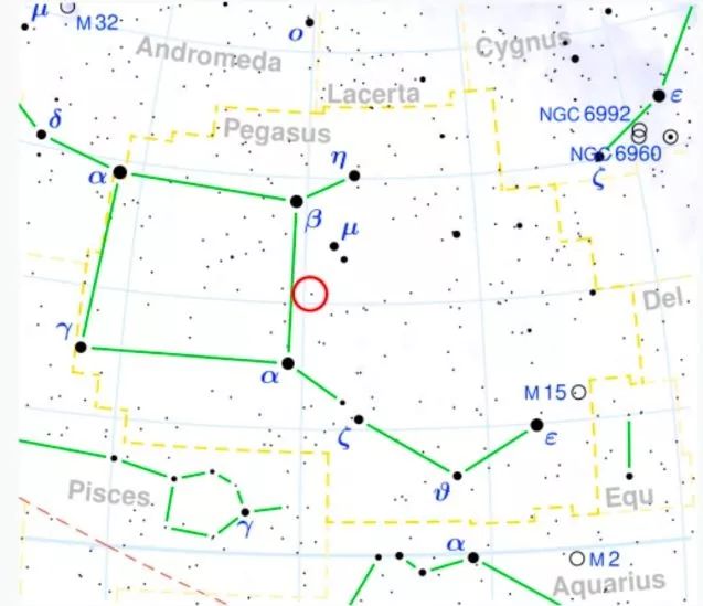 飞马座(Pegasus)在秋季北方的天空比较明显,包括一个近乎正方形的大四边形。Pegasus 51是被红圈标识的这颗从地球上肉眼可见的恒星。| 图片来源:Wikimedia Commons