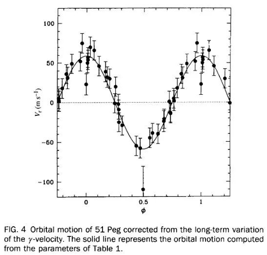 马约尔和奎洛兹构建了一种新型光谱仪同时测量142颗恒星的光谱,终于在1995年发现,飞马座的一颗编号为51的恒星(Pegasus 51)的光谱频率周期性变化。通过分析恒星光谱频率随时间的变化,人们可以计算出它的径向速度随时间的变化,拟合相应的正弦时间函数,从而计算它围绕质心旋转的周期,模拟描述它的轨道,并推算出影响它如此运动的天体的质量范围和距离范围等信息。很快人们证实,这不是一个双星系统,而是一个质量至少是地球150倍的类似木星的行星,这颗行星依随它的母星被命名为飞马座 51b。