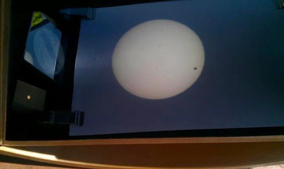 这是作者本人在2012年6月6日拍摄的太阳投影的照片,图中除了较小较浅的太阳黑子,还有一个明显的黑圆斑。那是金星凌日,也就是金星挡在了太阳与地球之间。不像月亮遮挡太阳的时候会发生阳光大受影响的日食,由于金星距离地球很远,金星凌日只能挡住一点点阳光,好像给太阳长颗小“痣”。