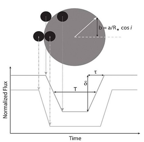我们观测到的恒星亮度会随时间的变化分为几个阶段: 恒星亮度不受影响的时间段,恒星亮度从开始变暗(开始被遮挡)到最暗(最多遮挡)的过程,以及维持最暗(最多遮挡)的时间段,还有从开始恢复到恢复最亮的时间段,再经历保持最亮的时间段。通过仔细地计算和比较不同时间段的时长,可以计算出这个行星公转一周的周期、大致尺寸、与恒星的大致距离等等。