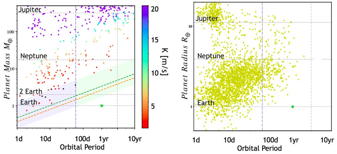 目前发现的系外行星的质量(左)与半径(右)随公转周期(横坐标)的变化与地球(绿星)之间的比较。| 图片来源:Debra Fischer & John Brewer.