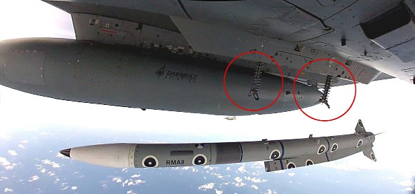 ▲ “流星”空空导弹进行弹射式发射的瞬间,注意发射架上伸出的两个活塞作动器,头部安装有箍环,在推动弹体的瞬间,挂架的挂钩与弹体的挂点解锁。