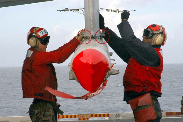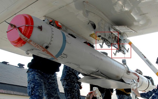 ▲ 正在挂载的SLAM空地导弹,红圈处为挂架上的防摆器,以防止导弹摆动